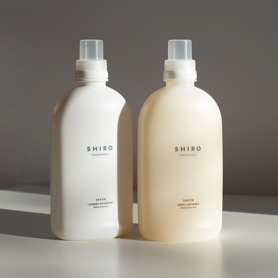 SHIROの香りを堪能できるランドリーリキッドとファブリックソフナー。新生活に、やさしい香りがそっと寄り添います。