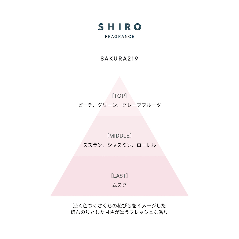 フローラルを基調にした『さくら219』の香りは、心地のよい光の中で淡く色づくさくらのようにやさしく広がります。