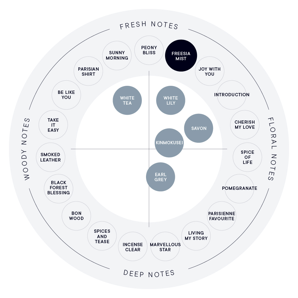 FREESIA MISTは、アップルやアプリコットのフルーティーな香りに、透明感のあるグリーンや上品なローズなどを組み合わせた、SHIRO PERFUMEで最も人気が高い香りです。