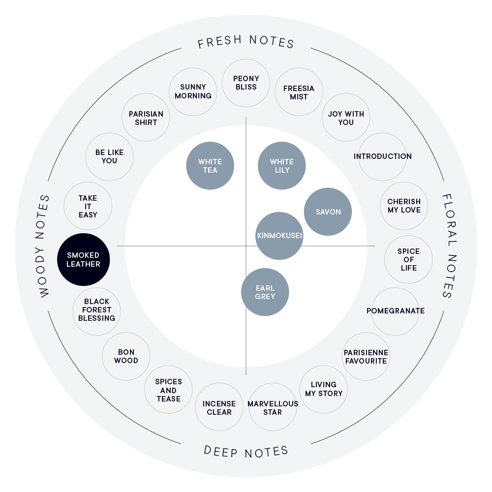 まるでレザーを燻しているような、あたたかみのあるSMOKED LEATHERの香りは、SHIRO PERFUMEの中でも人気の高い香りです。