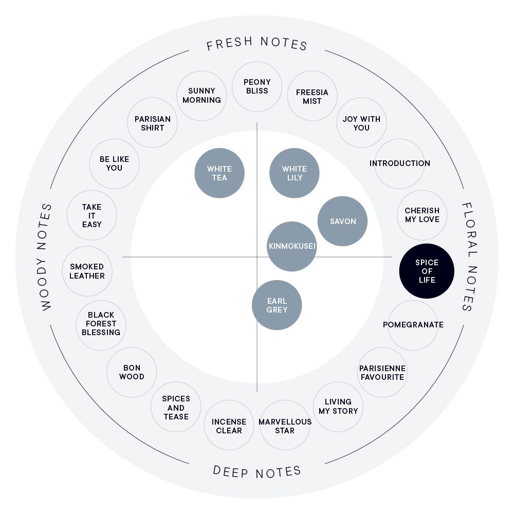 SPICE OF LIFEは、ジンジャーやカルダモンなどが溶け合うスパイシーさの中に、上品な薔薇が凛と咲いているような、印象的な香り。