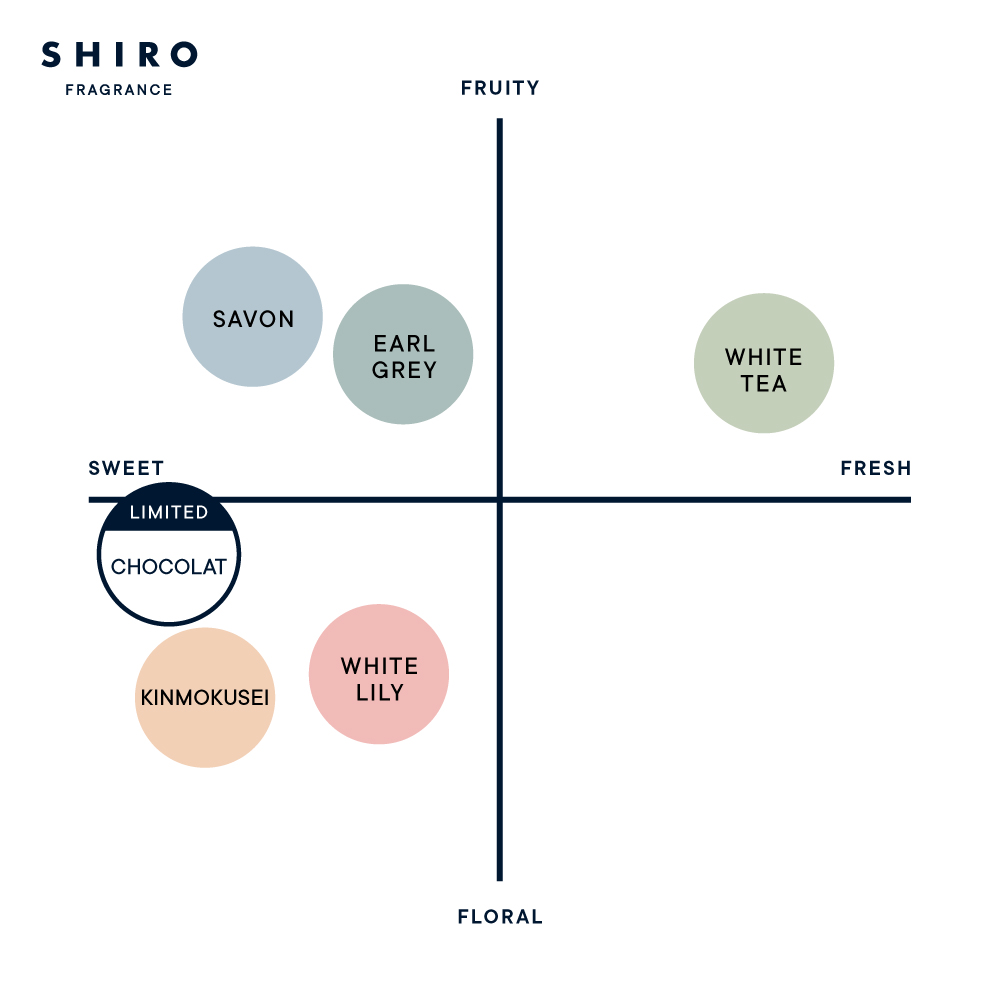 ・フレグランスシリーズの中でも、カカオの持つ甘い香りをしっかり堪能できる限定フレグランスの「ショコラ」。アールグレイやホワイトティーと比べ、落ち着きのあるフローラルもほのかに感じることができます。