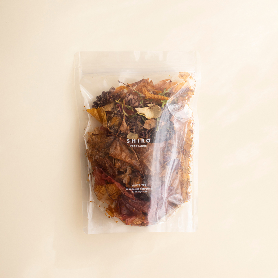 北海道の森林で見つけた落ち葉や小花、木の実などを乾燥させ、爽やかで落ち着きあるホワイトティーの香りをまとわせました。 余分な手は加えず、自然が生み出した素材の魅力を、そのまま活かしたポプリです。 こっくりとした赤や黄色のグラデーションを楽しみながら、やさしく深みある香りで、心安らぐひとときをお過ごしください。