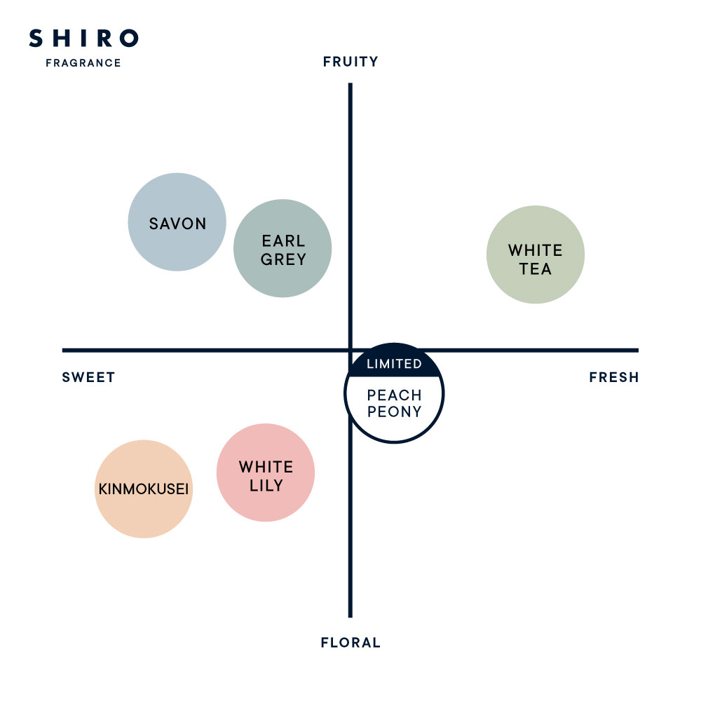 ピーチピオニーはホワイトリリーよりもフルーティーで、アールグレイよりもフローラルな香りです。 限定フレグランスのピオニーがお好きな方はもちろん、チアアップルやペアーなど、みずみずしいフルーティーフローラルがお好みの方にもおすすめです。