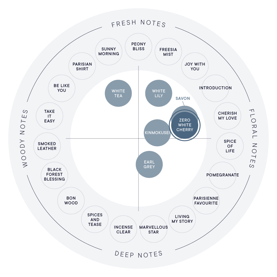 また、ジャスミンやローズ、ヒヤシンスなどの優美な花々に、フレッシュなピーチを添えることで、可愛らしさと大人っぽさをあわせ持つ香りに仕上げました。これからの季節に彩りを添える、「ゼロホワイトチェリー」の香りを心ゆくまでお楽しみください。