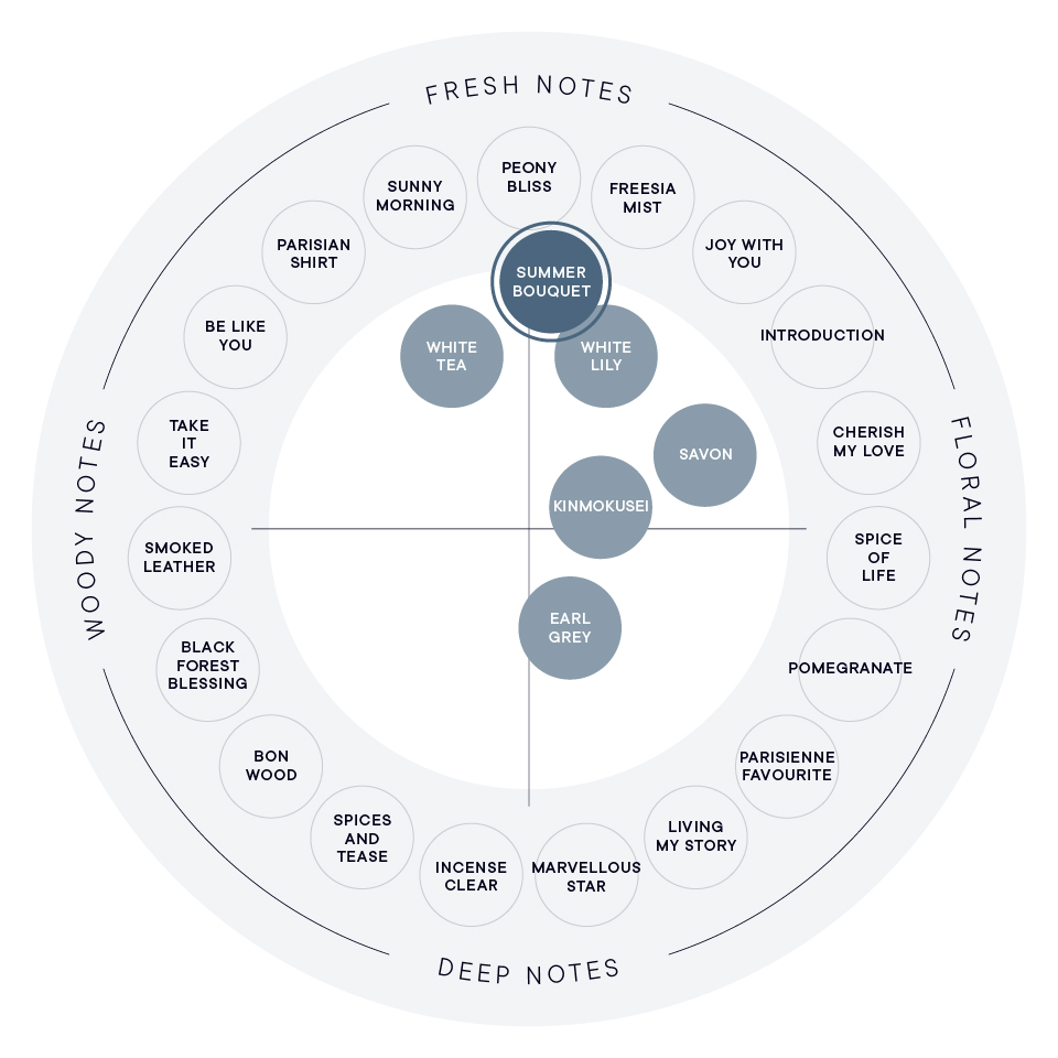 透明感のある可憐な花々を束ねたようなサマーブーケの香りに、ホワイトリリーを重ねればフローラル溢れる華やかな香りに、ホワイトティーを重ねればすっきりした爽やかなフローラルの香りになります。