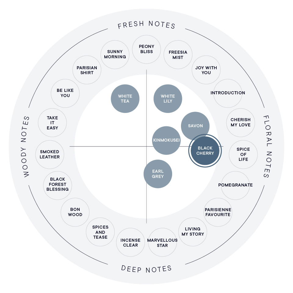 「ブラックチェリー」は、甘酸っぱいフルーツと優雅な花々が溶け合う、可愛らしさと大人っぽさをあわせ持ったフルーティーフローラルの香りです。