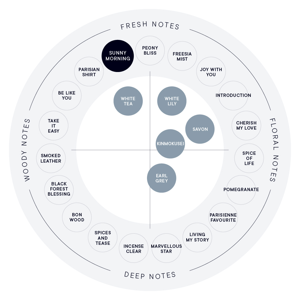 SUNNY MORNINGは、爽やかな朝の目覚めをイメージしたフレッシュフローラルの香り。