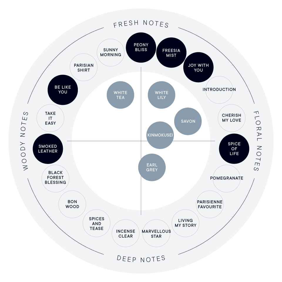 香りはお好みに合わせて、6種類(FREESIA MIST、BE LIKE YOU、JOY WITH YOU、PEONY BLISS、SPICE OF LIFE、SMOKED LEATHER)からお選びいただけます。