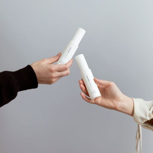 首筋など太い血管が通っているところに付けると、体温で香りが早く揮発するので短く感じてしまうことがあります。もし顔回りに香りを付けたいときは、空間に2~3プッシュし、その下をくぐり香りを纏ってみてください。