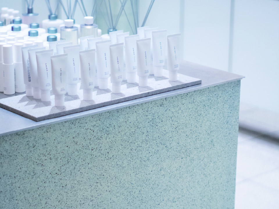 ディスプレイのメインマテリアルである淡いグリーンのテラゾー什器にバイブレーション仕上げされたステンレスの天板を組み合わせました。空間は間接照明を配し、全体に軽やかな印象を与えます。お店の両端には、ブランドの世界観を表現するビジュアルスペースを設置し、コミュニケーションを豊かにしました。